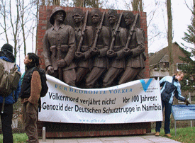 Am 11.8.2009 wird in Bremen neben dem Anti-Kolonial-Denk-Mal (Bremer Elefant) das Mahnmal "Im Gedenken an die Opfer des Völkermords in Namibia 1904-1908 und der Schlacht am Waterberg" der Öffentlichkeit übergeben. (Foto: H. Wegmann) Weitere Informationen zu dem Denkmalprojekt finden sich unter: |