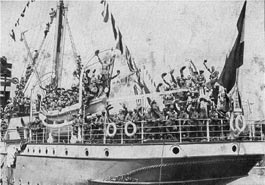 Die Hamburger Werft wurde 1877 gegründet und avancierte zur größten Kriegswerft der Kaiserzeit. Für Kaiser Wilhelm II baute die Werft eine militärische Seeflotte, die größer sein sollte, als diejenige Englands. Je mehr die Hamburger Überseeunternehmen ihre Geschäfte ausdehnten, desto mehr drängten sie nach militärischer Unterstützung. Den 'Flaggenhissungen' in den Kolonien wurde mit der bedrohenden Kulisse der Kriegsmarine Ausdruck verliehen (Kanonenbootspolitik). "Immer wieder konnte ... die Wahrnehmung gemacht werden, dass das Zeigen der deutschen Flagge, das Erscheinen unserer Kriegsschiffe an der Küste auf die Eingeborenen großen Eindruck machte, und - als Kuriosum sei es erwähnt - hatten die Schiffe recht viele und dicke Schornsteine, dann war gleich leichteres Arbeiten mit den schwarzen Krausköpfen festzustellen." (Graudenz/Schindler: Die Deutschen Kolonien, 1994, S. 288) |