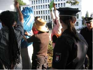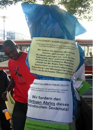 Am 25.09.06 demonstrierte die Black Community in Hamburg und mit ihr insgesamt 25 Organisationen gegen die koloniale Schimmelmann-Büste. Sie fordern den sofortigen Abriss des Denkmals und eine öffentliche Entschuldigung des Bezirksamts Wandsbek und der Stadt Hamburg. Die Grün-Alternative Liste und die SPD Wandsbek brachten am 12.10.06 einen Antrag zur Entfernung des Denkmals in die Bezirksversammlung; dieser scheiterte jedoch an der CDU-Mehrheit. Mehr Infos: www.black-hamburg.de |